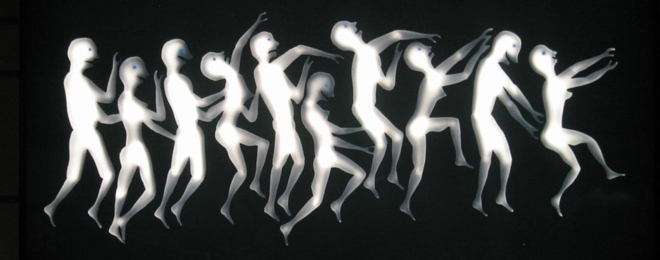 I don’t know the title of the piece either, but possibles could be ‘Creative Conga’ or perhaps ‘Ticklefest’ or as the figures look a bit like puppets maybe a good title would be ‘Without Strings’. (Sorry-desperate attempt by non-physicist to mention strings!)
