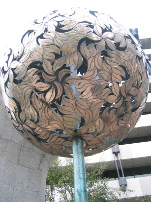 (Click for larger.) The first is the “Tree of Gold (Crainn an Oir)”, by Eamonn O’Doherty. It resides in the plaza of the Central Bank of Ireland. The second is the “Sphere with Sphere”, by Arnaldo Pomodoro (great name!), which sits in front of the Berkeley library on the grounds of Trinity College. I’ve heard that it is supposed to represent the sphere of industry and technology emerging from the sphere of nature, but I have not checked that.