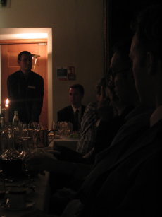 The banquet was excellent, of course. Trinity’s kitchens were in good form, as were the serving staff, who were a pleasure to watch. They have some nice touches to their performance that are worth looking out for. As an example, when serving a course, they burst forth from the side doors all smartly turned out, and walk crisply to various points all around the tables (which were gathered into a single table in the shape of the head a three-tined fork, or a giant “M” or “W” if you prefer). Only when they are all in position does one of them give a nod, and then they start serving. So everyone gets their course, and begins eating, at the same time. Nice professional touch that you usually only see at banquets at the finer restaurants. Here’s a portion of the table: