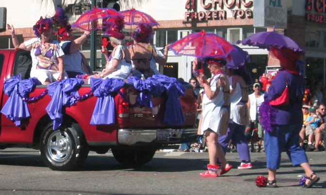 They are followed (always) by a women’s group the name of which I never catch, every year. They’re doing their own in-your-face celebration of leisure time, as a counterpoint to their sibling men’s group, I think. They’re usually dressed largely in purple, with purple hats and parasols. This year several of them had rather fetching bikinis, as you can see: