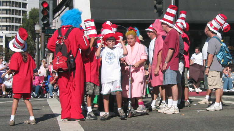 There are a number of floats/groups genuinely interested in the younger part of the crowd, in case you were wondering whether all of the parade was ironic stuff for the grown ups. Here’s a Dr. Seuss reading group of some sort. They did a little drill too, but I did not catch what it was… (out of shot were the Cat in the Hat, the Grinch, and other characters I cannot identify):