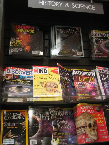 And if you’re like me and don’t actually look at the words on the covers, just the pretty pictures, then the Scientific American with the 3,300,000 year old skull jumps out as being the oddball out, until the Criminal Mind on the MIND magazine reminds you that it’s not another nebula/planet/thing-like-that (especially if you say the swirly stuff behind the hand is colorful, and therefore a nebula) …