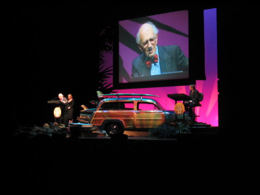(Above: MC for the night, PBS Newshour host Jim Lehrer, and the LA Times’ Kenneth Turan, on the set/stage. I really like the work of both of these guys…)