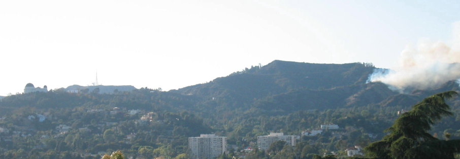 Click for larger. Flames and smoke of the Griffith Park fire today. You can see them clearly while carrying on with your business in the neighbourhoods near the park.