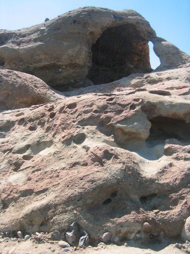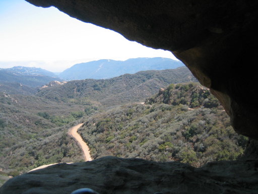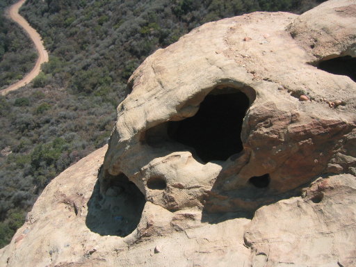 I don’t actually know if this is the official reason why, but to me, there’s obviously an eagle shape. Do you see it? It is a rather huge rock. You can’t see anyone on it to give you a sense of scale, but if you go back to the first picture of it, you’ll see some holes in it. (Click the thumbnails below for larger views of some shots of them, including a view from one of them of a fire trail in the distance, not far from where I took the picture of the approach to the rock itself.)