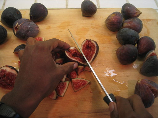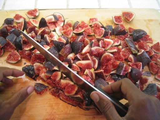 Some slicing of the figs into quarters (or smaller if desired), along with preparation of lemon zest and some peel (three more figs were ready on the tree today so I picked them and added them to the ones above):