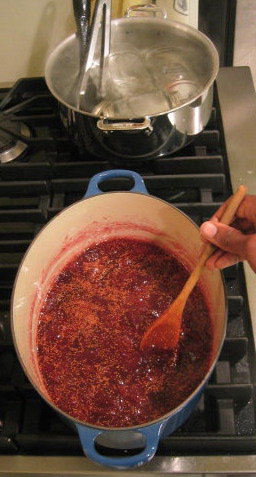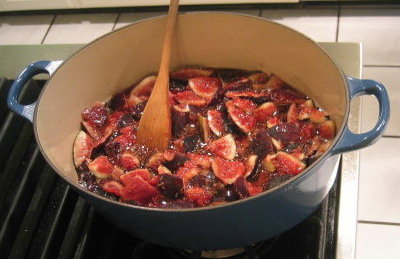 After melting the sugar in the water and simmering, adding the fig pieces and stirring… letting them come to a boil before simmering.