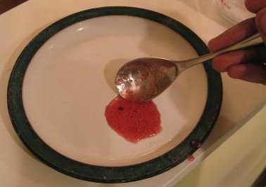You can see the much darker consistency (richer colour and flavour) after over an hour of heat and occasional stirring. The jars for bottling are being sterilized in the pan behind. Testing for setting consistency on a very cold dish.