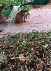 sprinkled in some handfuls of organic compost (E. B. Stone’s) that I had lying around, along with a few handfuls of top soil I bought a while back – the topsoil smelled a lot of manure, which is a good sign. Both of these latter should be rich in the right kind of bacteria, and so popping some in will help seed the whole mix nicely and help the processing begin. Moisture? I’ll leave it to your imagination to decide whether I sprinkled water or whether I brought myself to instead sprinkle Household Compost Activator (as described in the site I linked to above) from that watering can.