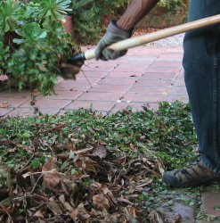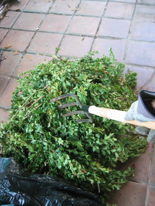 Then several days (two weeks, in fact) passed until today. Well, actually I did do some preparation last week. I put aside some clippings from some hedge work I was doing elsewhere in the garden. Today I took them out and began to prepare them. Basically, one wants a component of green matter in the mix, and so this was what I had here. A week away was supposed to have wilted everything and made it easy to get off the branches, but I’d left them in the bag, and forgot to put them in the sun for the week, so they were as freshly cut. Well, I bent my back into it, and put together a nice pile of small green bits – simply using my gloved hands to strip leaves off the branches. I used a pair of sharp clippers to help cut up some branch tops as well, so there’s leaves and soft short twiggy bits. Then I opened up the bags of dry brown matter that I’d gathered from various points in the garden for the last couple of weeks.