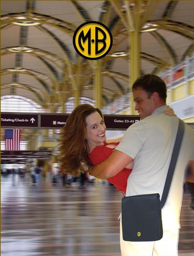 The US companies that were represented tend to go out of their way to break down the “perceived anti-manly” phobia….labeling the bags stupid names like “Manbag”, and so forth. I found an amusing analysis of one of these companies’ marketing cues on one website. [update: see image right, from Man-n-Bag. Their slogan is “If it’s not a Man-n-Bag, it’s a purse!”] (Can’t find the link to the analysis now.) On the one hand they have the picture of the guy with the bag, but then they compensate by having him in the arms of some tall blonde female who is not into him because of his love of musical theatre (not that there’s anything wrong with that), and even an American flag features in the same picture as though to reassure the potential buyer that if he carries a handbag he’s not effeminate, gay, or (shock horror) French. (Not that there’s anything wrong with any of those.) It’s all very very ridiculous.