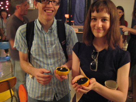 (Triple Chicken Foot), and tables with coffee, lemonade, and snacks of various sorts. Lots of people were milling around chatting with each other, and right in the middle were Erik and Kelly, getting people to dig their hands into the dirt and plant! What were they planting? They were using orange peel halves as containers within which to sprout garlic. You can do it on your window sill, and get tasty garlic sprouts for your five minutes of work.