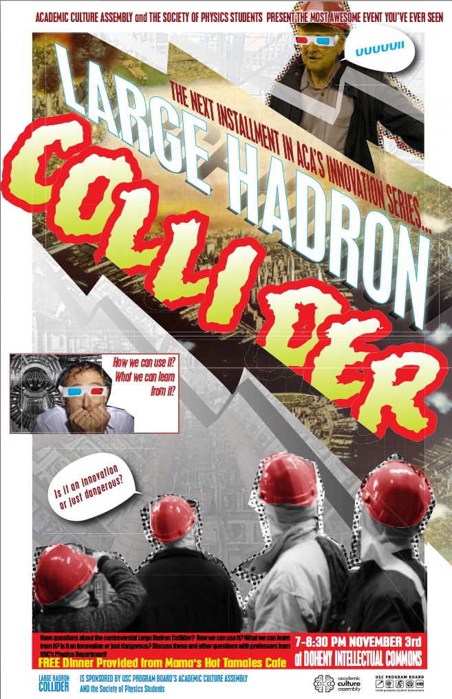 Actually, this is a bit of a late announcement, but worth doing anyway, in case you happen to be looking for something fun to do with the Society of Physics Students. From yesterday’s talk at the Center For Inquiry on particle physics and string theory (thanks to the many of you who came!), I now go to join a panel tonight here on the USC campus to talk about the Large Hadron Collider (LHC). There have been many posts here on that… search the archives for more information, or type LHC into the search engine on the right. It should be fun and there’s free food from Mama’s Hot Tamales! It should be noted, for anyone keeping track, that in order to serve on this panel, I am giving up a dream: An Evening With Helen Mirren. Sigh. Also taking part on campus tonight. Click the poster for a larger view.