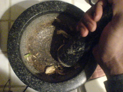 To be honest, I don’t really measure this. Just… enough. I use a small 5 inch shallow saucepan about 1/2 full of water, and two heaped large spoons of meal…. So maybe 3 cups water, 1 cup or a bit more of meal? Does not matter too much, as you can evaporate off a lot of the water if you have excess (not too much excess though – don’t want to over cook) later. Then I went to the mortar and pestle and ground two cloves of garlic, some black pepper, and a sprig of chopped rosemary from the garden. All that went into the pan, along with salt. You’ve got to keep stirring as the boiling comes in, or you’ll get lumps. Keep stirring while it boils, and get that extra moisture out, letting it cook down into a thick paste, almost sticking in the pan, and your spoon can stand up in it. Make sure it had enough boiling to soften and cook the corn… but not so much water and cooking that it makes a mush.