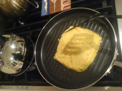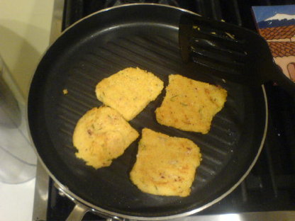 Then get your favourite skillet or griddle pan up to highish heat with some olive oil in it, turn the paste out into it, flatten and shape to your preferences, and fry a bit until nice and brown on each side.