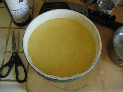 Now for the main cake batter. (Turn on the oven to pre-heat to 350F.) This is a pretty standard batter, slightly richer in eggs than some. I used 3/4 cup of sugar and combined it with some vanilla essence (2 tsp), 3 egg yolks and 2 eggs (all from large-medium eggs) and kept that moving together for a while to blend. Then I added in a cup of flour, 1+ tsp baking powder and 1 tsp salt that I’d dry-mixed together separately. I stirred that in gradually, and then stirred in (not over-beating now) a 1/2 cup of melted butter. (Had I remembered, I’d have put in a tad more ground cinnamon, some nutmeg, and some fresh lemon zest, but I got distracted somehow).