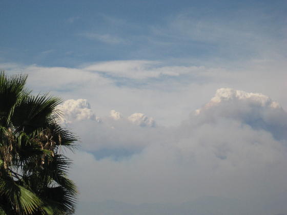 Here’s a recent (about 5:00pm today) shot of the mushroom clouds of smoke. You can just see the edge of the foothills near the bottom: