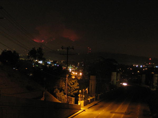 Continuing my series of posts on the approach of the fires to Mount Wilson and the threat to the Observatory (see previous for information and discussion – this morning I am happy to hear that the radio news is now mentioning the Observatory and not just the tv and radio antennae up there)… Last night at about midnight I decided to look out to see whether I could see anything going on, and was greeted with a sight from the pages of Tolkien describing Orodruin (Mount Doom):