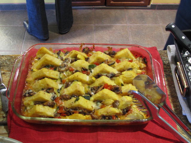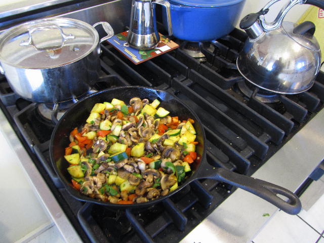 So here is another group of ingredients. These are largely the vegetables that will accompany the polenta and the salsa roja I made the night before. Notice that the polenta has been sliced into 24 triangles, ready for the next step. Those are red bell pepper choppings in front, along with majoram and cilantro. Mushrooms being suatéed in olive oil- what a lovely smell that always produces! After some minutes, half of the garlic is added, and then after another 5 minutes or so I put everything aside in a bowl. Then on to the zucchini (or “courgette” – I used half a yellow and half a green, for variety), suatéing again for about five minutes with the remaining garlic going in, and the peppers. I sprinkled about a teaspoon of cayenne pepper into it too. Then a few minutes later, the heat goes off and I put back in the mushrooms and toss it all together with the herbs (leaving a little for a garnish).