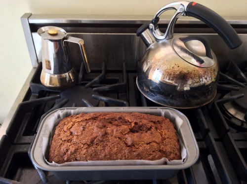 half a cup of sugar for a while. Nice therapeutic beating for a few minutes. Then beat an egg and mix that in with whatever spices you like (I do grated cinnamon and nutmeg, and a little (1tsp) vanilla essence). Mix a cup and a half of flour with a 1/4 tsp of salt and a tsp of baking soda, and then stir them in. Then finally mix in the walnut-date moist combination. You’re done. Put it into a greased pan (I also lined with greaseproof paper) and put it into the middle of the (preheated to 350 F) oven and let it sit there for just under an hour.