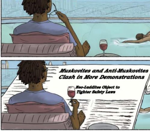 Saw this split over Elon Musk coming over a year ago. This is panel from my graphic short story “Resolution” that appears in the 2018 SF anthology Twelve Tomorrows, edited by Wade Roush (There’s even an e-version now if you want fast access!)