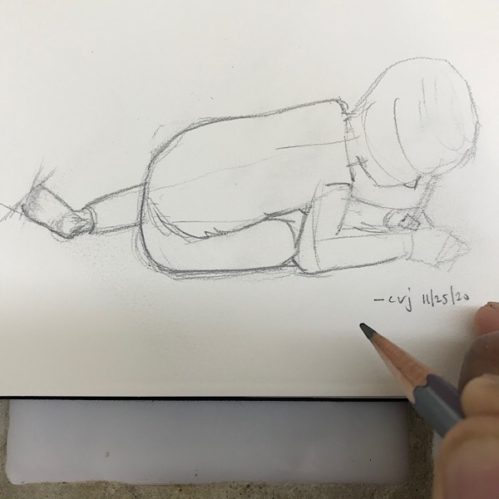 @Miquel – Yes it looks like that doesn’t it! That’s what happens when you finish some lines after the subject has long since gone…. I think what happened is that the foot was in a position where the toes were not entirely visible when I was swiftly roughing out… later on as I strengthened a few lines I must have then emphasized an extra toe or two and pushed the foot too far into completion before stopping the drawing entirely. I’d better adjust back to the construction strokes! Good call! –cvj